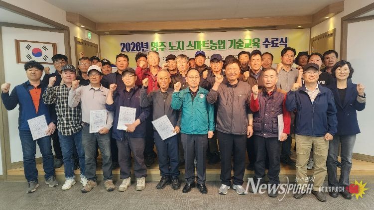 뉴스펀치 이현승 기자 | 영주시농업기술센터는 지난 23일 농업체험교육관에서 교육생과 관계자 등 36명이 참석한 가운데 ‘영주 노지 스마트농업 기술교육’ 수료식을 개최했다.