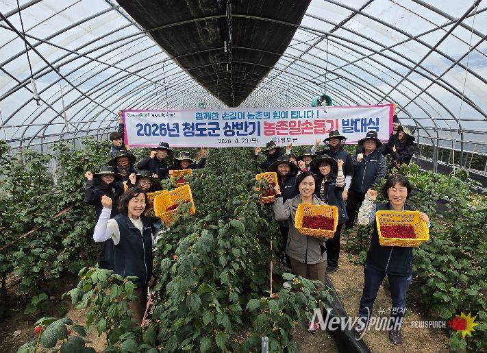 뉴스펀치 박세훈 기자 | 청도군은 농촌인구 감소와 고령화로 일손 부족을 겪고 있는 농가를 지원하기 위해 4월 23일 운문면 방지리 산딸기 농장에서 발대식을 개최하고, 농가의 산딸기 전정 및 수확 작업을 도우며 2026년 상반기 농촌일손돕기의 힘찬 시작을 알렸다.