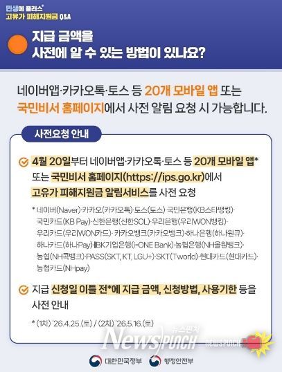 알림 서비스는 네이버, 카카오톡, 토스, 금융사 앱 등 국민 대다수가 이용하는 20개 모바일 앱과 국민비서 누리집을 통해 신청할 수 있다. 기존 이용자는 서비스만 추가하면 되며, 미가입자도 간단한 인증 절차를 거쳐 가입 가능하다.