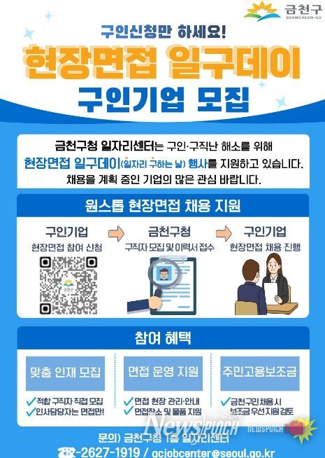 뉴스펀치 박상훈 기자 | 금천구는 구인·구직난을 해소하고, 기업의 원활한 채용을 지원하기 위해 ‘현장면접 일구데이’ 참여 기업을 상시 모집한다고 밝혔다.
