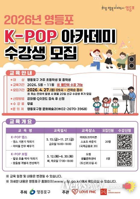 뉴스펀치 박상훈 기자 | 영등포구가 관내 청소년의 예술적 재능을 발굴하고 문화예술 체험 기회를 넓히기 위해 ‘영등포 K-POP 아카데미’를 운영한다고 밝혔다.