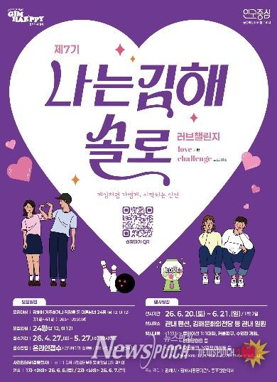 뉴스펀치 박세훈 기자 | 김해시는 오는 6월 20일부터 21일까지 1박 2일 일정으로 관내 펜션과 김해문화의전당 등에서 진행하는‘제7기 나는 김해솔로-러브챌린지’참가자 24명(남·여 각 12명)을 모집한다고 24일 밝혔다.