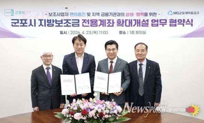 뉴스펀치 박상훈 기자 | 군포시는 지방보조금 전용계좌 개설 금융기관을 기존 시 금고인 NH농협은행에 더해 새마을금고까지 확대하기 위한 업무협약을 23일 체결했다고 밝혔다.