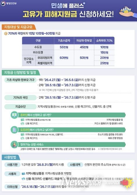 민생안정지원금 2차는 4월 27일부터 5월 22일까지, 고유가 피해지원금 1차는 4월 27일부터 5월 8일까지 각각 신청·접수할 예정이며, 군은 군민들이 신청 기간을 놓치지 않도록 지속적인 홍보와 안내를 이어갈 계획이다.