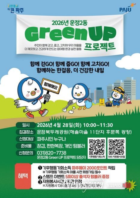 뉴스펀치 박상훈 기자 | 파주시 운정2동은 오는 28일 10시부터 운정 북두레공원에서 주민과 함께하는 시민 참여형 환경·건강 프로그램 ‘제3회 그린 업(Green UP) 프로젝트’를 개최한다.