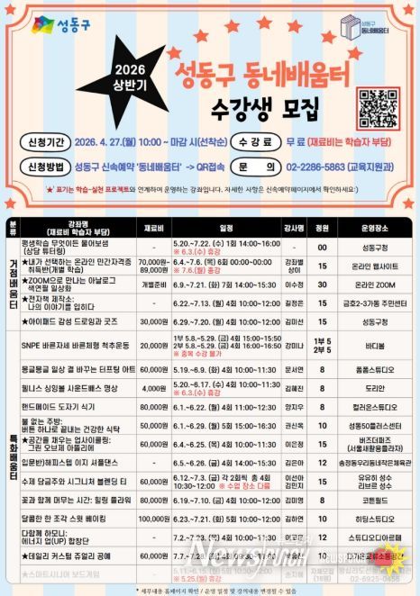 뉴스펀치 박상훈 기자 | 서울 성동구가 올해 약 3,800만 원의 예산을 투입해 주민 주도형 평생학습 생태계를 조성하는 ‘2026년 성동구 동네배움터’ 운영에 본격적으로 나선다고 밝혔다.