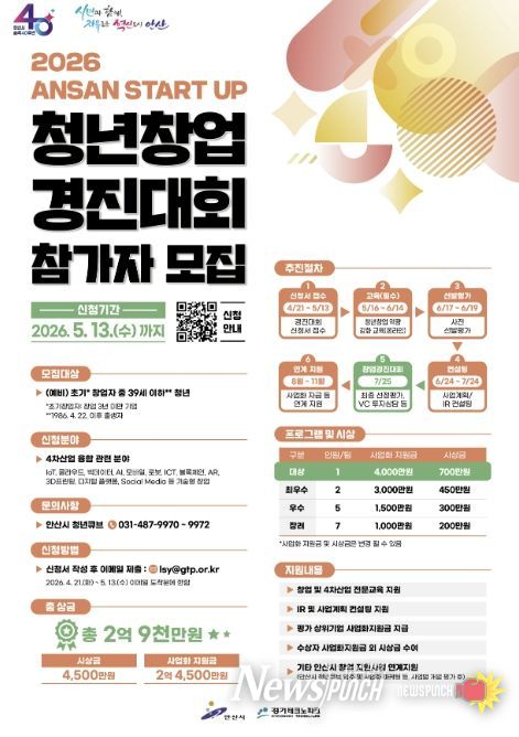 뉴스펀치 박상훈 기자 | 안산시는 창의적인 아이디어를 보유한 청년 창업가를 발굴하기 위해 내달 13일까지 ‘2026 안산 스타트업 청년창업 경진대회’ 참가자를 모집한다고 24일 밝혔다.