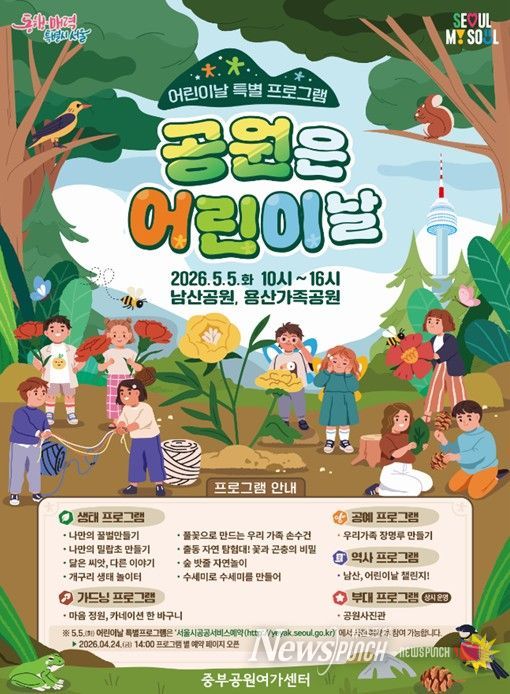 뉴스펀치 박상훈 기자 | 서울시 중부공원여가센터는 5월 5일 어린이날을 맞아 ‘남산하늘숲길’ 개방 이후 산책 명소로 많은 사랑을 받고 있는 남산공원과, 푸르른 잔디가 펼쳐진 용산가족공원에서 온 가족이 함께 즐길 수 있는 특별프로그램 '공원은 어린이날'을 운영한다고 밝혔다.