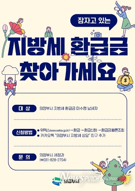 뉴스펀치 박상훈 기자 | 의정부시는 납세자가 아직 찾아가지 않은 지방세 환급금을 돌려주기 위해 5월 말까지 ‘지방세 환급금 일제정리 기간’을 운영한다.