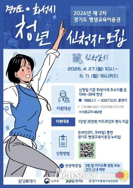 뉴스펀치 박상훈 기자 | 화성특례시는 청년층의 자기계발과 역량 강화를 지원하기 위해 ‘2026년 평생교육이용권 지원사업’ 지역특화(청년) 분야 2차 이용자를 모집한다고 밝혔다.
