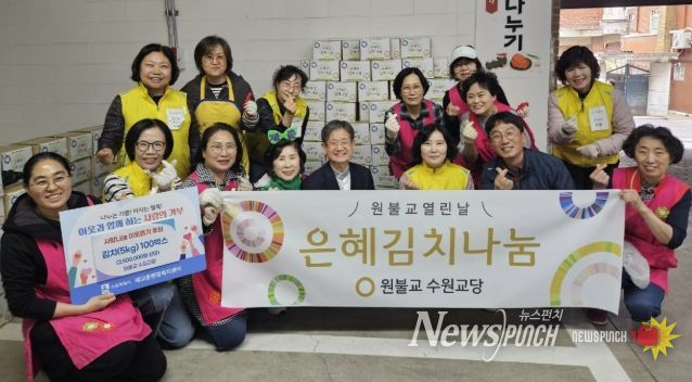 뉴스펀치 박상훈 기자 | 수원시 팔달구 매교동은 지난 22일, 원불교 수원교당(교구장 김도천)으로부터 직접 담근 배추김치(5kg) 100박스를 기부받았다고 밝혔다.