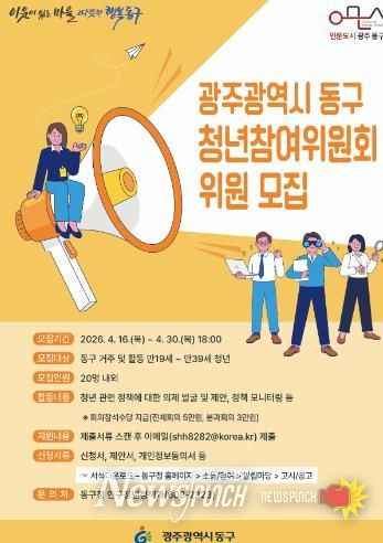 뉴스펀치 김용희 기자 | 광주 동구는 청년이 정책의 수혜자를 넘어 정책의 주체로 참여하고, 지역 변화를 이끌어갈 ‘제6기 청년참여위원회’ 위원을 공개 모집한다고 밝혔다.