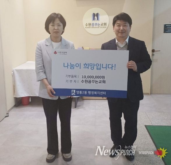뉴스펀치 박상훈 기자 | 수원시 영통구 영통2동은 지난 23일 수원꿈꾸는교회가 지역사회 내 취약계층 지원을 위해 교인들과 함께 모금한 사랑의 성금 1천만원을 영통2동 행정복지센터에 기부했다고 밝혔다.