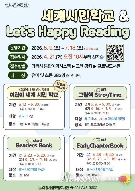 뉴스펀치 박상훈 기자 | 의왕시 글로벌도서관이 책을 통해 세상을 이해하고 체험하는 다문화 이해 프로그램 '어린이 세계 시민 학교'와 영어 읽기 문해력 향상을 위한 단계별 맞춤 프로그램 'Let’s Happy Reading'의 참여자를 모집한다.