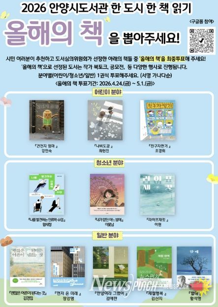 뉴스펀치 박상훈 기자 | 안양시는 2026년 한 도시 한 책 읽기 ‘올해의 책’ 선정을 위한 시민 선호도 조사를 오는 5월 1일까지 온·오프라인으로 진행한다고 24일 밝혔다.