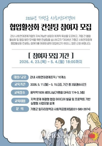 뉴스펀치 박상훈 기자 | 가평군이 사회연대경제 조직 간 협업 활성화를 위해 ‘2026년 사회연대경제 협업활성화 컨설팅’을 추진하고, 참여 조직을 5월 4일까지 모집한다.