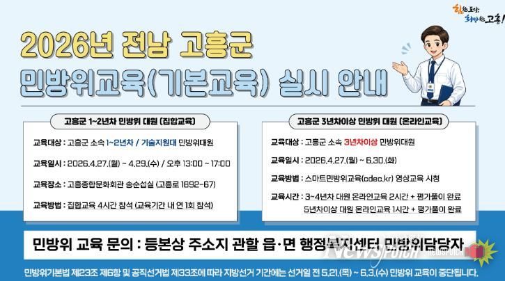 뉴스펀치 김용희 기자 | 고흥군은 민방위대원의 대응 역량을 강화하고자 2026년 상반기 민방위 기본교육을 실시한다고 밝혔다.