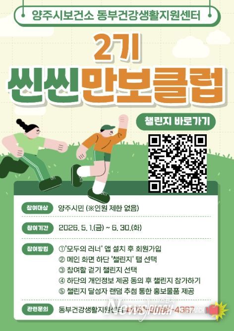 뉴스펀치 박상훈 기자 | 양주시보건소 동부 건강생활지원센터에서 지역 주민의 건강생활실천율 향상과 비만율 개선을 위해 ‘2026년도 씬씬 만보클럽 2기’ 참여자를 모집한다.