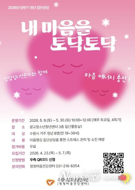 뉴스펀치 박상훈 기자 | 수원시청소년청년재단 청청마음건강센터는 학업과 취업준비, 직장생활 등 경쟁 중심 환경으로 인해 심리적 소진을 겪는 관내 청년들을 대상으로, 오는 5월 7일까지 전문가가 참여하는 집단상담 프로그램 ‘내 마음을 토닥토닥’ 참가자를 모집한다고 밝혔다.