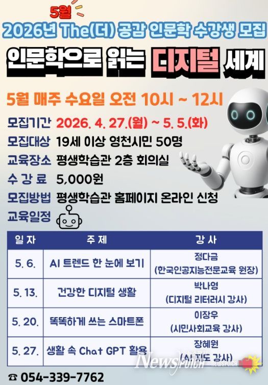 뉴스펀치 박세훈 기자 | 영천시 평생학습관은 시민의 인문학적 소양 함양을 위해 운영하는 ‘The(더) 공감 인문학 특강’ 5월 수강생을 27일부터 5월 5일까지 모집한다고 밝혔다.