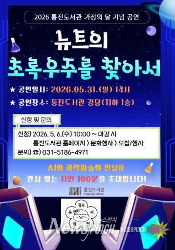 뉴스펀치 박상훈 기자 | 김포시 통진도서관이 가정의 달을 맞아 온 가족이 함께 즐길 수 있는 공연 '뉴트의 초록우주를 찾아서'를 오는 5월 31일 오후 2시 통진도서관 강당에서 개최한다.