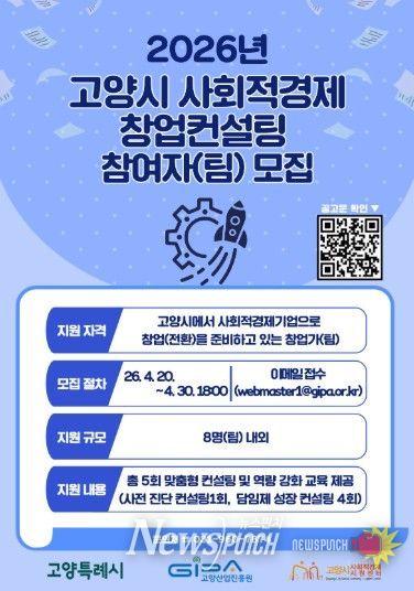 뉴스펀치 박상훈 기자 | 고양산업진흥원이 운영하는 고양시사회적경제지원센터가‘2026년 고양시 사회적경제 창업컨설팅 사업’에 참여할 예비 창업자(팀)을 오는 30일까지 모집한다.