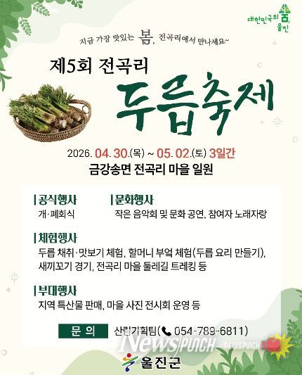 뉴스펀치 박세훈 기자 | 울진군 금강송면 전곡리에서 봄철 대표 산나물인 두릅을 주제로 한 ‘제5회 전곡리 두릅축제’가 오는 4월 30일부터 5월 2일까지 3일간 전곡리 마을 일원에서 개최한다.