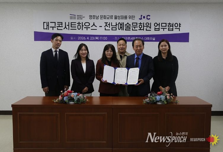 뉴스펀치 조평훈 기자 | 대구문화예술진흥원 대구콘서트하우스는 4월 23일 전남예술문화원(대표 마윤미)과 영호남 문화교류 활성화를 위한 업무협약을 체결했다.