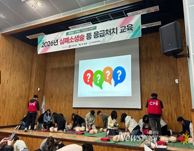 뉴스펀치 박세훈 기자 | 고성군은 4월 23일부터 24일까지 이틀간 고성군농업기술센터 2층 친환경농업연구소 강당에서 법정의무교육대상자 등 100여 명을 대상으로 ‘2026년 심폐소생술 등 응급처치 교육’을 실시했다.