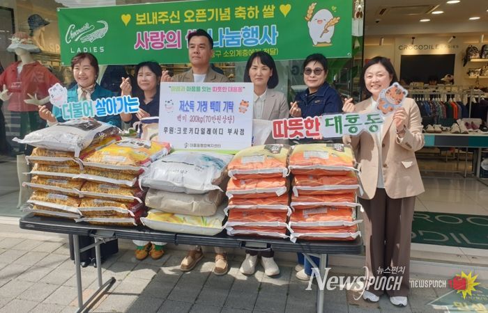 뉴스펀치 이현승 기자 | 대전 중구 대흥동은 지난 24일 크로커다일레이디 대전부사점(대표 임향희)이 개업을 맞아 축하 백미 330kg(120만 원 상당)를 대흥동·문창동에 기부했다고 밝혔다.