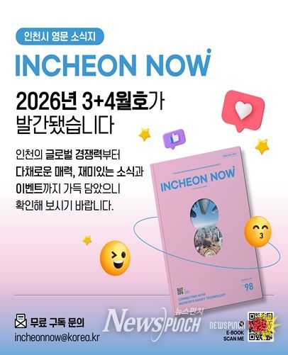 뉴스펀치 정홍균 기자 | 인천광역시는 도시의 혁신적인 정책과 차별화된 매력을 전 세계에 소개하는 영문소식지 '인천나우(Incheon Now)' 3·4월호(Vol. 98)를 발간했다고 밝혔다.