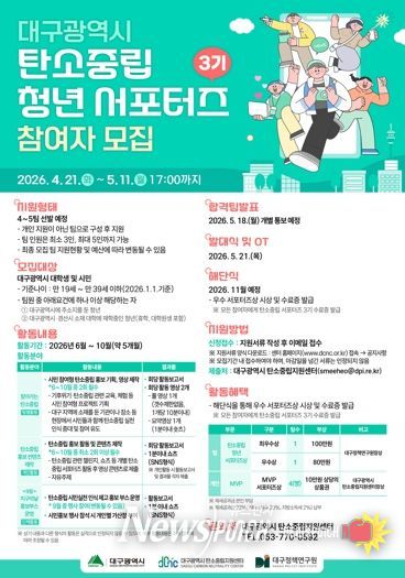 뉴스펀치 조평훈 기자 | 대구광역시는 기후위기 대응과 탄소중립 실천문화 확산을 위해 ‘대구시 탄소중립 청년 서포터즈 3기’ 참여자를 5월 11일까지 모집한다.