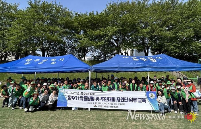 뉴스펀치 조평훈 기자 | 대구 동구청은 지난 23일, 지저동 둔치 체육시설에서 동구 지역자율방재단 단원 및 관내 22개 동 행정복지센터 재난안전담당자 120여명이 참여한 가운데 양수기 작동법 및 주민대피지원단 임무 교육을 실시했다.