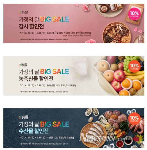 뉴스펀치 박세훈 기자 | 경상남도와 (재)경상남도투자경제진흥원이 운영하는 e경남몰(egnmall.kr)은 5월 가정의 달을 맞이해 4월 27일부터 예산 소진 시까지 전 품목을 대상으로 한 대규모 할인 기획전을 진행한다.