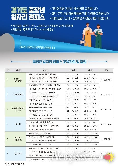 뉴스펀치 박상훈 기자 | 경기도가 중장년층의 재취업과 창업을 지원하기 위한 실무형 직업훈련 ‘중장년 일자리캠퍼스’를 올해 처음 추진하며 직업훈련 24개 과정별 25명씩 총 600명의 교육생을 모집한다.