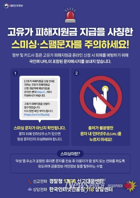 한편, 시는 ‘고유가 피해지원금 지급’을 사칭한 스미싱 문자에 대해 각별한 주의를 당부했다. 고유가 피해지원금은 카드사 또는 지역화폐 공식 앱이나 누리집(홈페이지), 오프라인에서만 신청이 가능하다. 특히 공공기관에서는 고유가 피해지원금과 관련된 인터넷 주소(URL) 링크 연결을 유도하는 문자를 보내거나 전화하지 않는다고 강조했다.