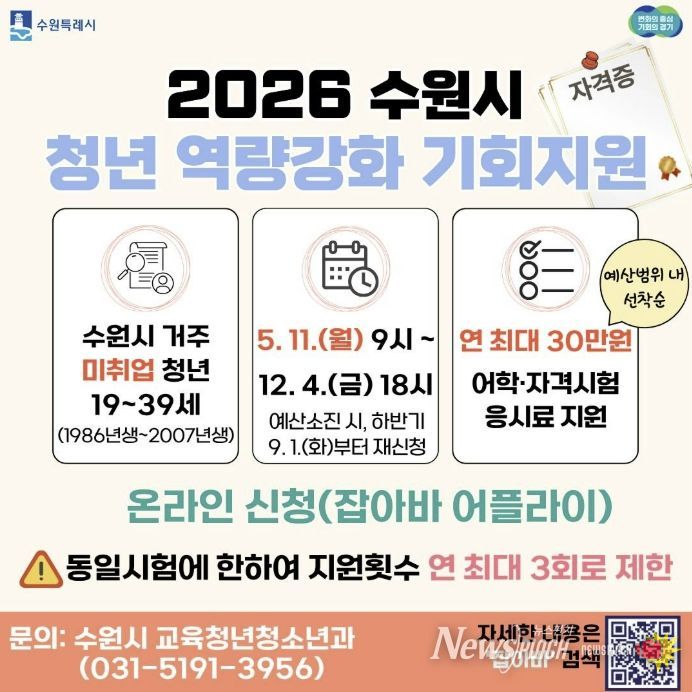 뉴스펀치 박상훈 기자 | 수원특례시는 미취업 청년의 취업 준비 비용 부담을 덜어주는 ‘청년 역량강화 기회 지원 사업’을 12월 4일까지 운영한다. 미취업 청년에게 어학·자격시험 응시료를 1인당 연 최대 30만 원 지원한다.