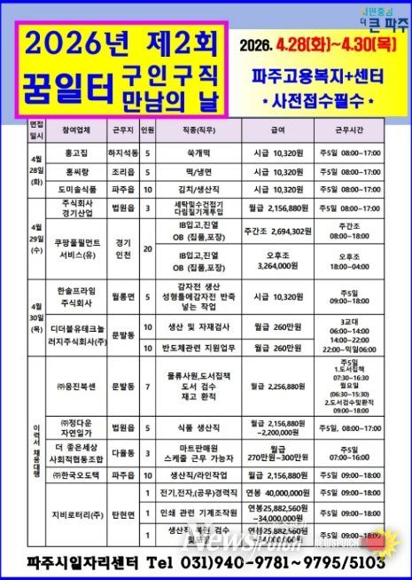 뉴스펀치 박상훈 기자 | 파주시는 오는 28일부터 30일까지 파주고용복지플러스센터(금촌동 엠에이치(MH)타워 8층)에서 2026년 제2회 ‘구인·구직 만남의 날’을 개최한다.