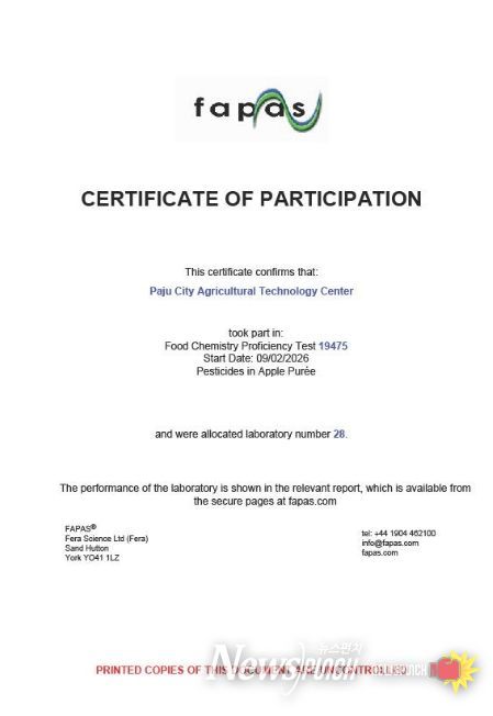영국 환경식품농림부 식품환경연구청(페라·FERA)이 주관하는 ‘국제분석능력평가’(파파스·FAPAS)는 전 세계 공인 분석기관들이 동일한 시료를 분석해 그 정확도를 상호 비교하는 권위 있는 평가 프로그램이다. 전 세계 60개 기관이 참여한 올해 평가(파파스 19475) 결과, 파주시 농산물 안전분석실은 사과 과립즙(퓨레) 시료에 대해 10개 잔류농약 성분을 분석해 제출한 전 항목에서 ‘만족’판정을 획득했다.