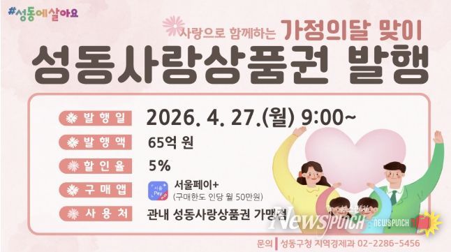 구 관계자는 “치솟는 물가로 모두가 어려운 시기이지만, 이번 성동사랑상품권 발행이 가계에는 든든한 보탬이 되고 소상공인들에게는 활력을 불어넣는 마중물이 되길 바란다”며, “가족의 따뜻함을 나누는 5월, 상품권 사용을 통해 지역 경제가 활짝 웃을 수 있기를 기대한다”고 말했다.