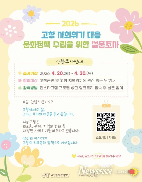 뉴스펀치 정홍균 기자 | 고창문화도시센터는 고창군이 직면한 사회위기 현황과 군민 인식을 파악하기 위해 ‘2026 고창 사회위기 대응 문화정책 수립을 위한 설문조사’를 추진한다.