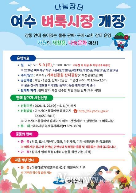 뉴스펀치 김용희 기자 | 여수시는 오는 5월 9일 오후 1시부터 4시까지 거북선공원 잔디광장에서 ‘2026년 제2차 여수 벼룩시장’을 개최한다고 밝혔다.