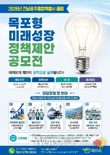 시 관계자는 “전남·광주 통합특별시 출범이라는 변화의 흐름 속에서 목포의 경쟁력을 높이고 지속가능한 성장을 이끌 정책 발굴이 중요하다”며 “참신하고 실현 가능한 정책 아이디어가 많이 제안되기를 기대한다”고 말했다.