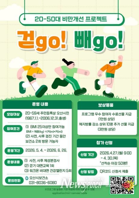 뉴스펀치 박상훈 기자 | 오산시보건소는 최근 젊은 층의 비만율 증가에 대응해 체질량지수(BMI) 25kg/㎡ 이상인 20~50대 오산시민을 대상으로 걷기 기반 비만 개선 프로그램 ‘걷GO 빼GO’를 운영한다고 밝혔다.