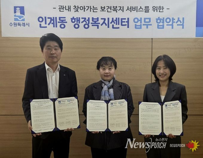 뉴스펀치 박상훈 기자 | 수원시 팔달구 인계동은 지난 24일, 지역사회보장협의체과 한전MCS(주) 경기지사 및 직할지점과 함께 취약계층 발굴과 지속적인 인적안전망 활동 참여를 위한 업무 협약을 체결했다.