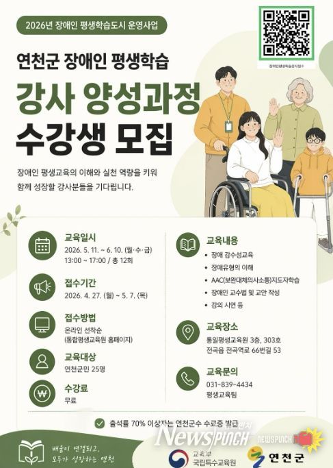 뉴스펀치 박상훈 기자 | 연천군은 교육부 국립특수교육원이 주관하는 '2026년 장애인 평생학습도시 운영 지원사업' 공모에 선정됨에 따라 장애인 평생교육 현장형 강사 양성 과정을 운영한다.