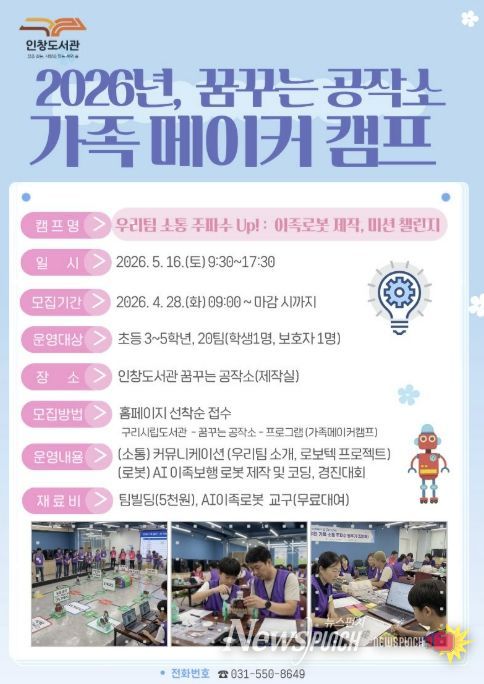 뉴스펀치 박상훈 기자 | 구리시 인창도서관‘꿈꾸는 공작소’는 오는 5월 16일 초등학생 자녀와 보호자가 함께 참여해 가족 간 유대감을 높이고 인공지능을 체험하는 '우리 팀 소통 주파수 Up! : 이족로봇 제작, 미션 챌린지' 가족 메이커 캠프를 운영한다고 밝혔다.
