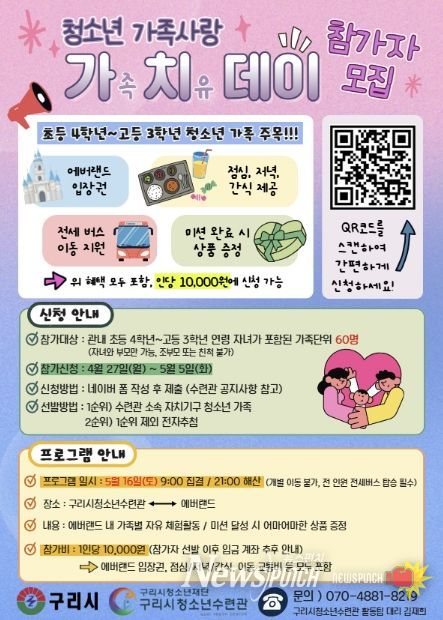 뉴스펀치 박상훈 기자 | 구리시청소년재단 청소년수련관은 가정의 달을 맞아 오는 5월 16일 관내 청소년 가족을 대상으로 ‘청소년 가족사랑 가치(가족치유)데이’를 운영하며, 참가 가족을 4월 27일부터 5월 5일까지 모집한다고 밝혔다.
