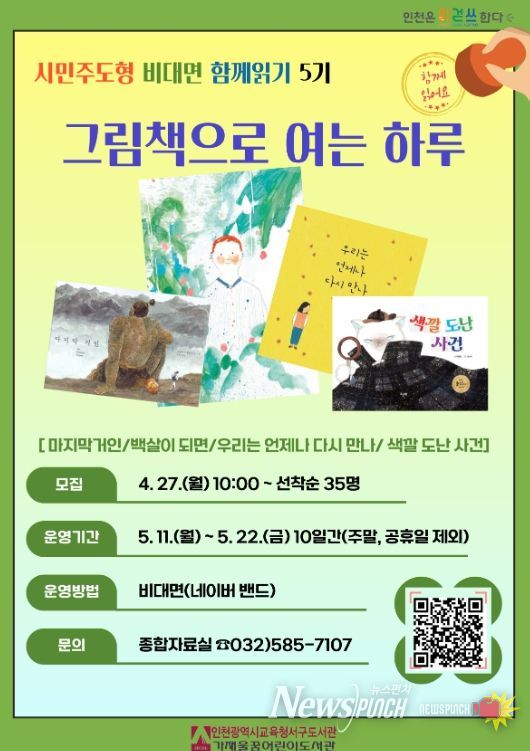뉴스펀치 정홍균 기자 | 인천광역시교육청서구도서관(관장 정연순)은 2026년 시민주도형 비대면 함께읽기 5기로, 5월 11일부터 5월 22일까지 ‘그림책으로 여는 하루’ 프로그램을 운영한다.