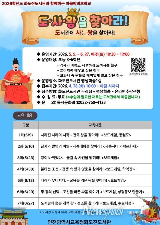 뉴스펀치 정홍균 기자 | 인천광역시교육청화도진도서관은 5월 9일부터 6월 27일까지 매주 토요일, 초등 3~6학년을 대상으로 역사 프로그램‘도서관에서 사는 왕을 찾아라!’를 운영한다.